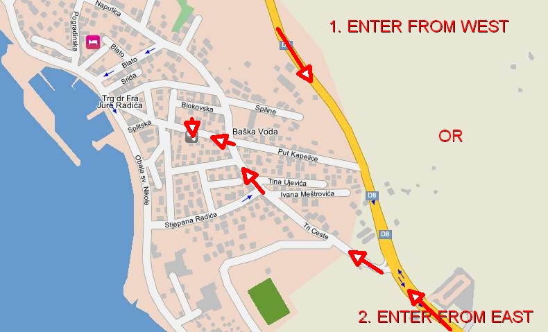 If you drive from Split with state road, it is easier to enter in Baska Voda at second Entrance and then folow upper map.